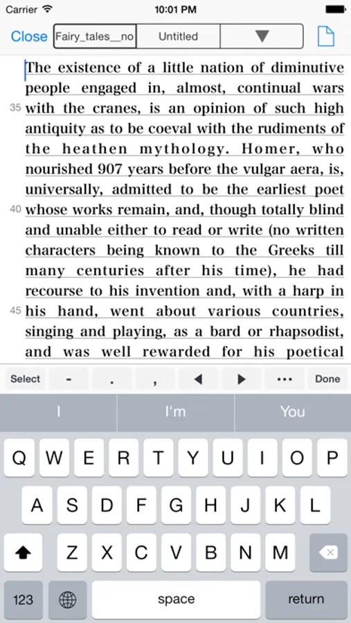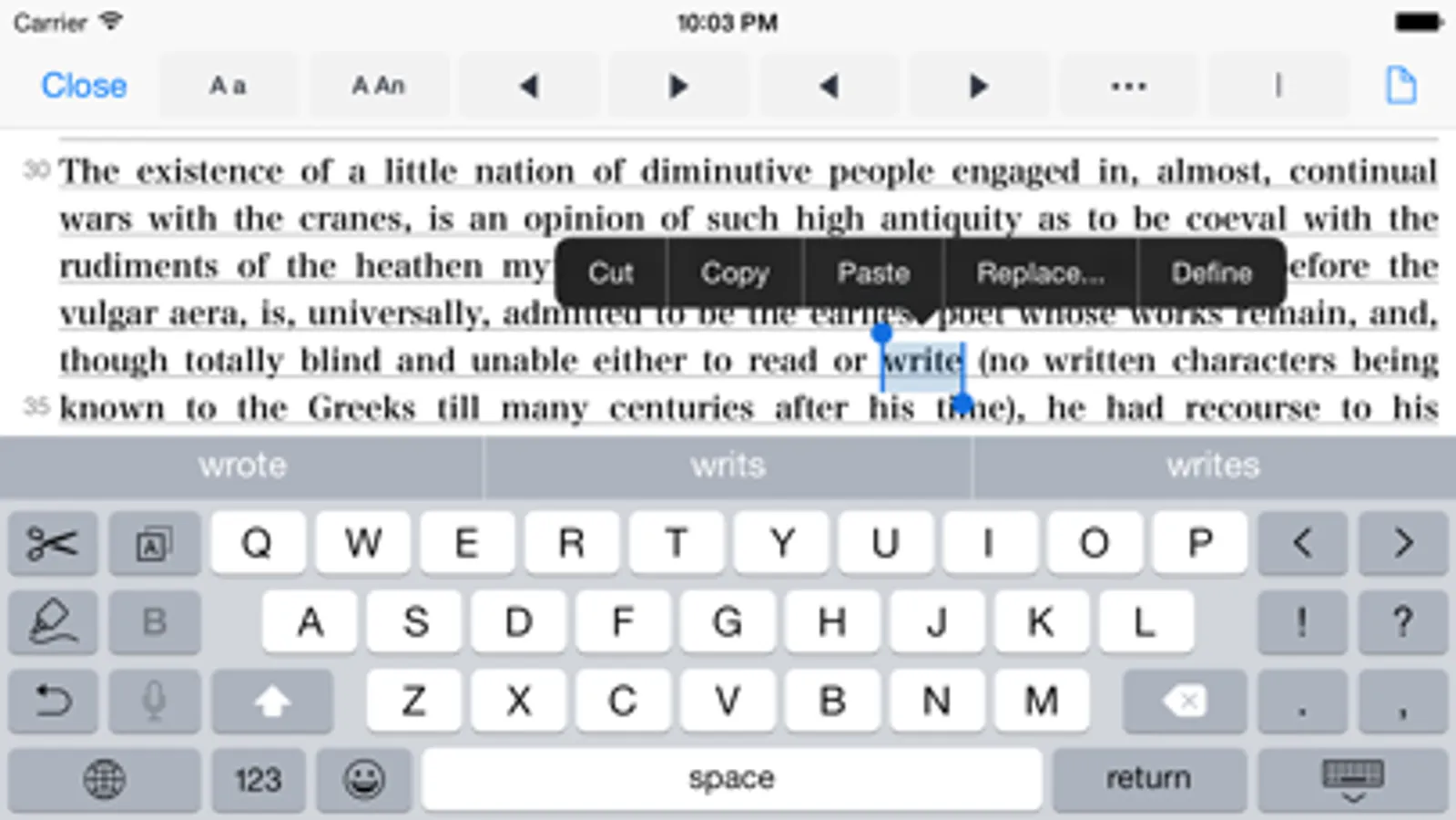 * Writing and editing are so natural - using just your fingers, and the standard onscreen keyboard and spell checker, and autocapitalize sentences help you write. Buttons like a keyboard's arrow keys do come in mighty handy to move an editing cursor to the left and the right.
