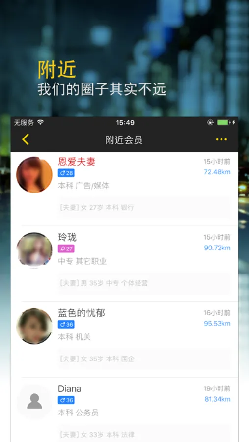 查看附近的同城会员,也可以漫游到其它城市,出差旅游交友,满足您各种交友场景
