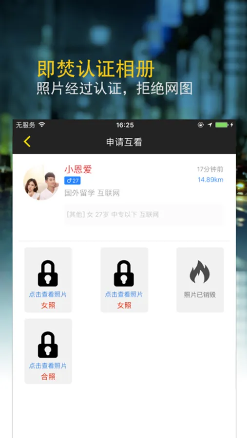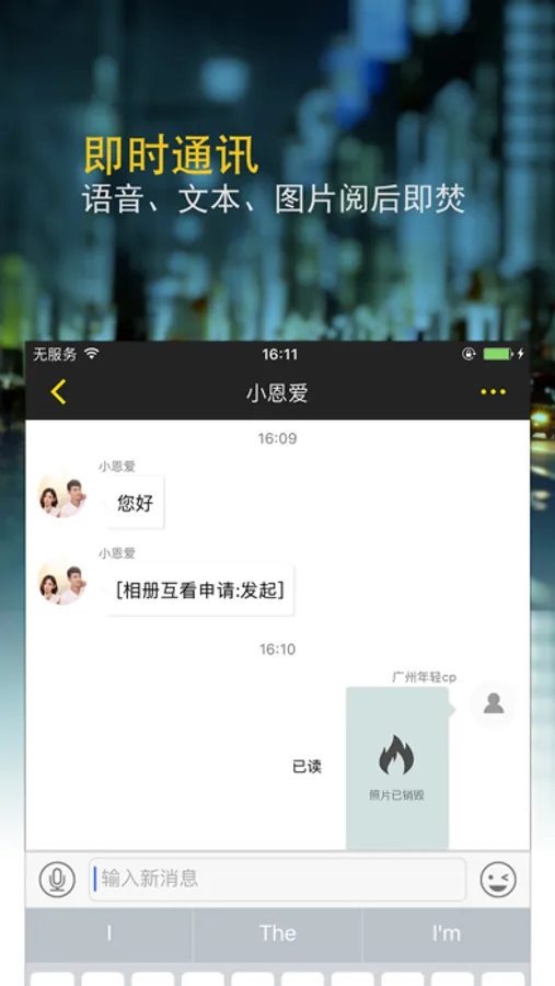 申请才能互看,一闪即焚,禁止截屏保存,加密传输,我们尽最大努力使别人对您的照片“眼看手勿动”