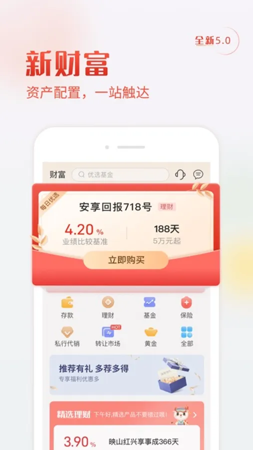 新财富:资产配置、一站触达。配置多种财富类型,更多选择。清晰的分类和一站式展示,让您更快、更便捷配置资产,实现财富升级。