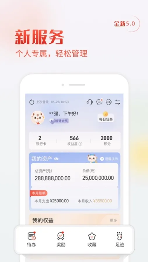 新服务:个人专属、轻松管理。资产总览、本月账单、积分权益,一目了然。待办、奖励、足迹、签约,轻松管理。