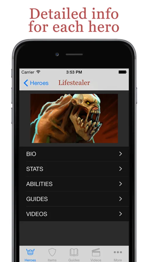 Complete information for each hero: image, stats, description, skills, guides, builds, videos, etc.