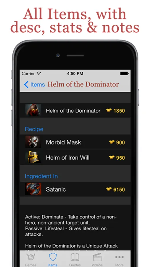 Full info for each item: stats, cost, recipe, etc.