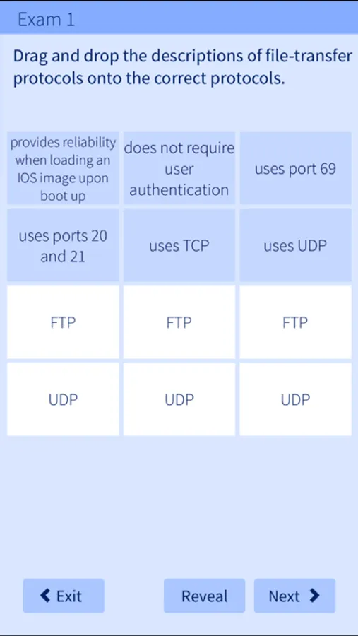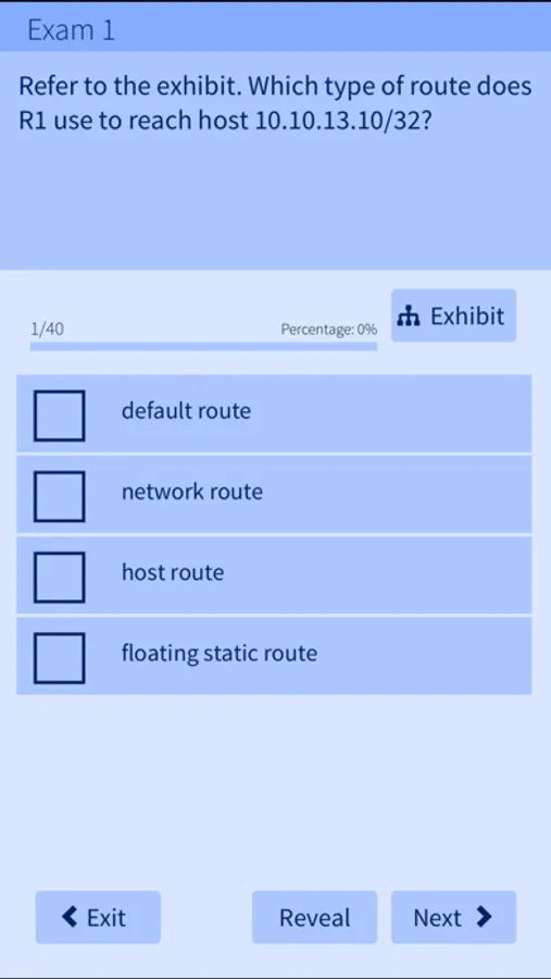 The app contains a "Full exam" consisting of all 4 exams containing 160+ questions. A Real Exam simulation is also included containing 50-60 questions featuring all the real time features to simulate the closest similarity to the real CCNA 200-301 exam.