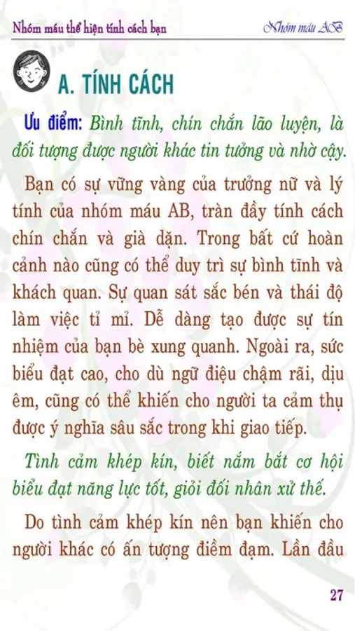 iBookstore xin trân trọng giới thiệu đến quý độc giả gần xa bộ sách “Nhóm máu thể thiện tính cách bạn” gồm 4 cuốn (Nhóm máu A, AB, B, O). Quyển “Nhóm máu thể thiện tính cách bạn – Nhóm máu AB” gồm 329 trang, sách giấy (sách truyền thống). Điều đặc biệt bộ sách này bán chạy (bestseller) vào năm 2011, 2012 và 2013. Mỗi nhóm máu đều thể hiện những đặc tính về tính tình và khí chất của người mang nhóm máu đó. Và còn nhiều điều bất ngờ, có thể bạn chưa biết về con người mình, về tính cách của bản thân, những tiềm ẩn,... Các bạn sẽ tìm thấy một số tính cách của bạn thông qua những quyển sách này. Hy vọng nó sẽ bổ ích và mang tính giải trí cho các bạn.