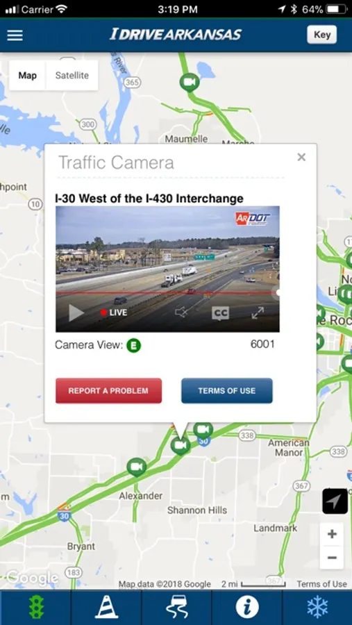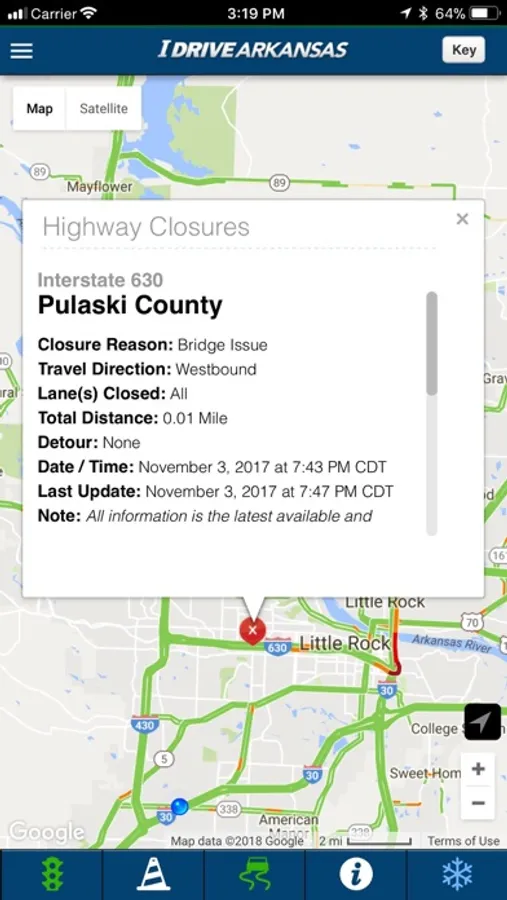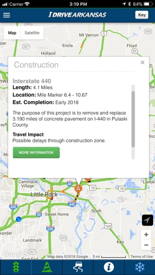 At a glance, IDrive Arkansas will show you the location of each construction zone on the state highway system. Activate the live traffic / traffic camera features for a clear understanding of how traffic is moving up to and through each construction zone. Add the weather radar feature and determine the impact storms are having on traffic moving through construction zones.