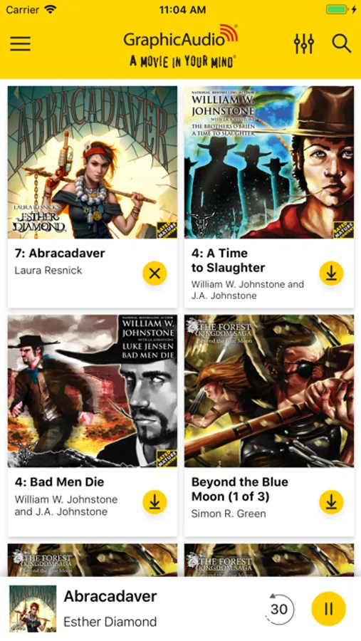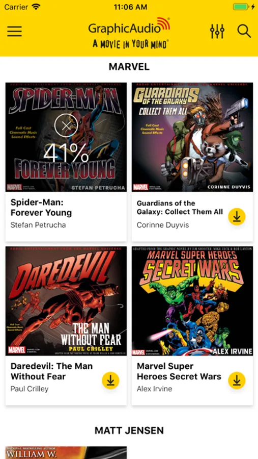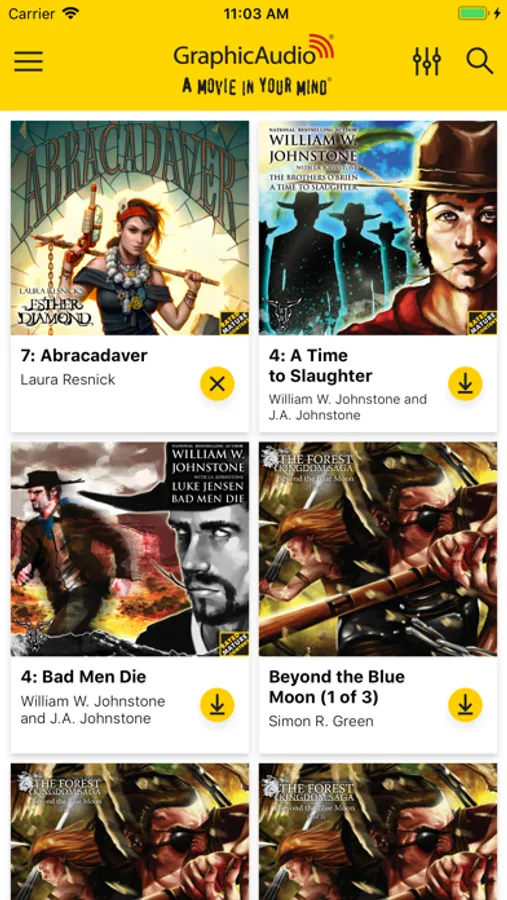 Simply purchase a Download from GraphicAudio.net, then activate the GraphicAudio Access™ App on your device and your GraphicAudio titles will be available to stream or download in a high quality audio format directly on your device. You can download a GraphicAudio title to your local device by pressing the "three little dots" button next to the book name or you can press the book cover to start streaming immediately.
