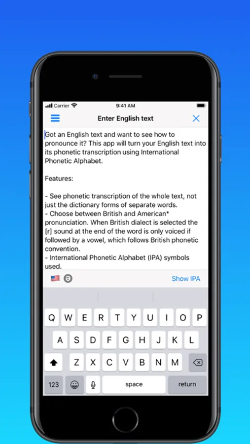 Got an English text and want to see how to pronounce it? This app will turn your English text into its phonetic transcription using International Phonetic Alphabet.