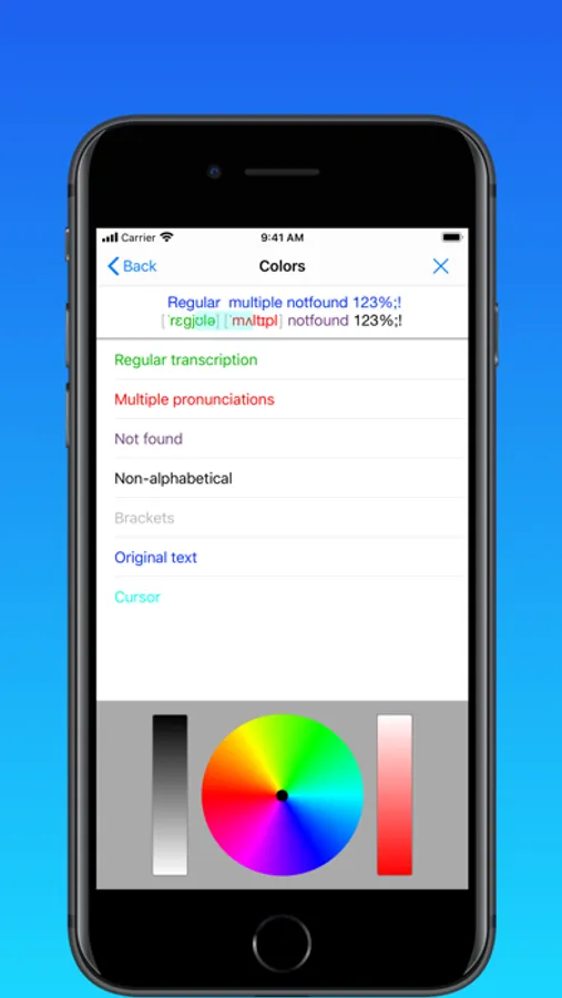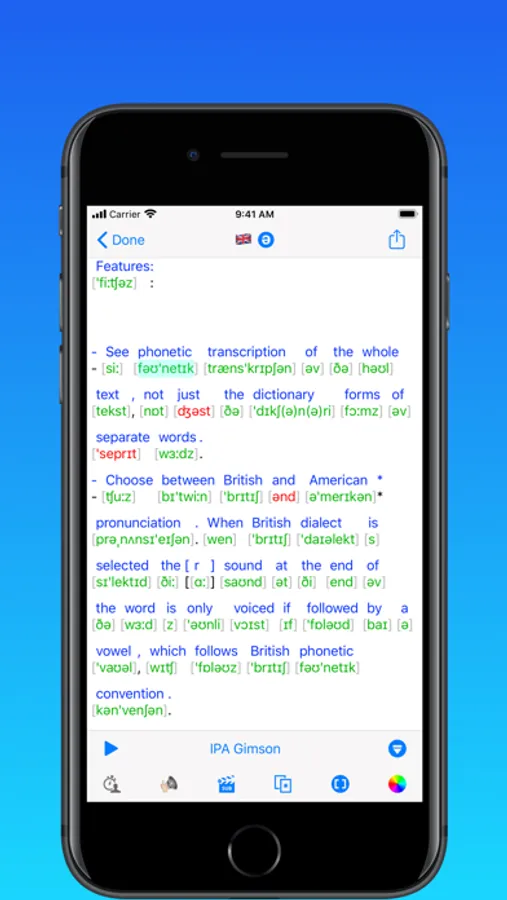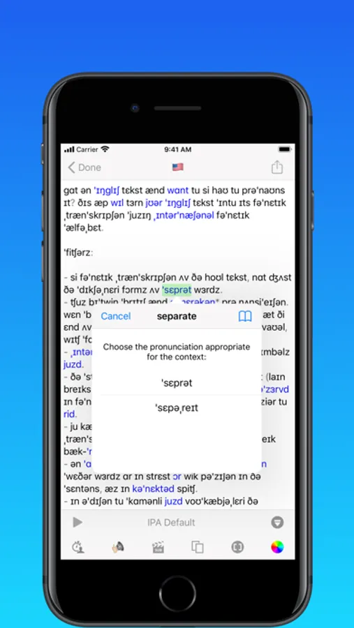 - Where a word has a number of possible pronunciations (highlighted in blue in the output) you can select the one that agrees with the context by tapping on it.