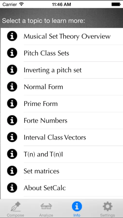 The app also includes a comprehensive written overview of musical set theory. Composers like Arnold Schoenberg, Alban Berg and Anton Webern employed set theory techniques to organize the pitch content of their works.