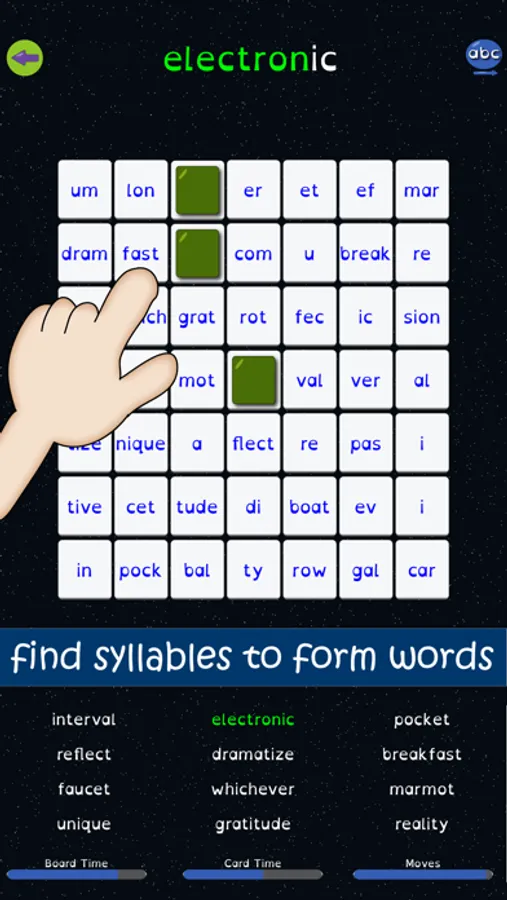 Syllable Word Search uses a unique memory card game and word search style game, that challenges players to form words by searching for syllables. Each of the 27 levels in Syllable Word Search provides increasing challenges to players.