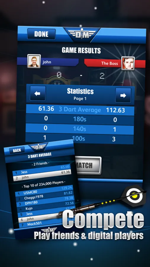 • Records three-dart averages, checkout percentages, total games won and many more stats.