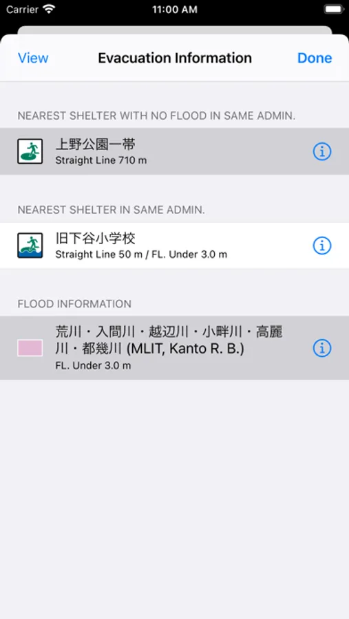 It searches the nearest shelter from a location that is the center of a screen map. And changes to detail check mode. You can check the nearest shelter and related floods in this mode. The finish is to tap the “Done” button.