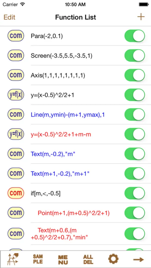 AMAZINGLY MANY KINDS OF GRAPHS! You can draw many kinds of graphs by setting function such as y=f(x), x=f(y), x=f(t) and y=g(t), f(x,y)=0, pole equation. (In the Lite version, we support only "y=f(x)" and command "Line")