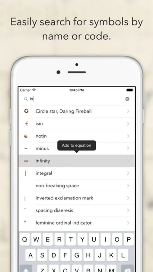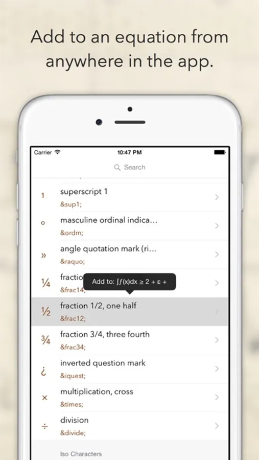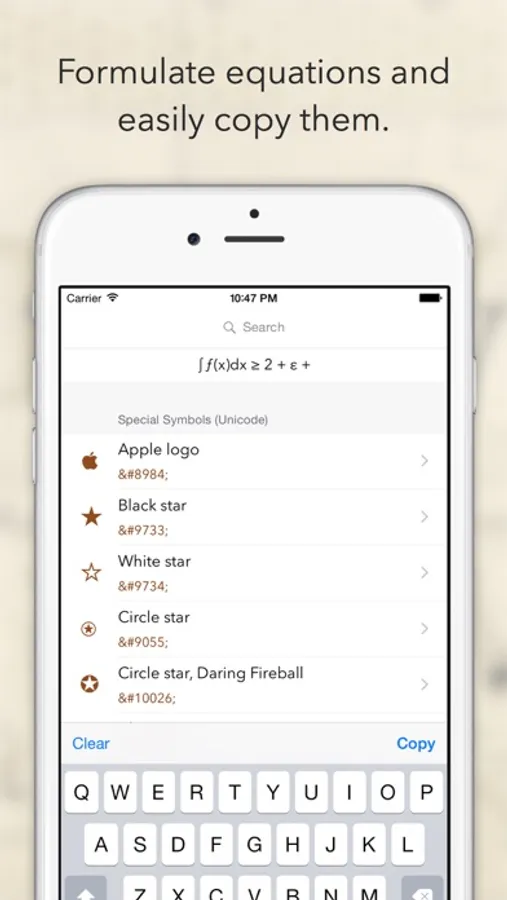 An equation editor can be found on the top of the table view. You can copy multiple symbols and they are added to the editor in order. You can also edit the equation using a keyboard, which also lets you easily copy it! Thus, you can compose entire equations in 'Simbol' and then copy them for use in another app.