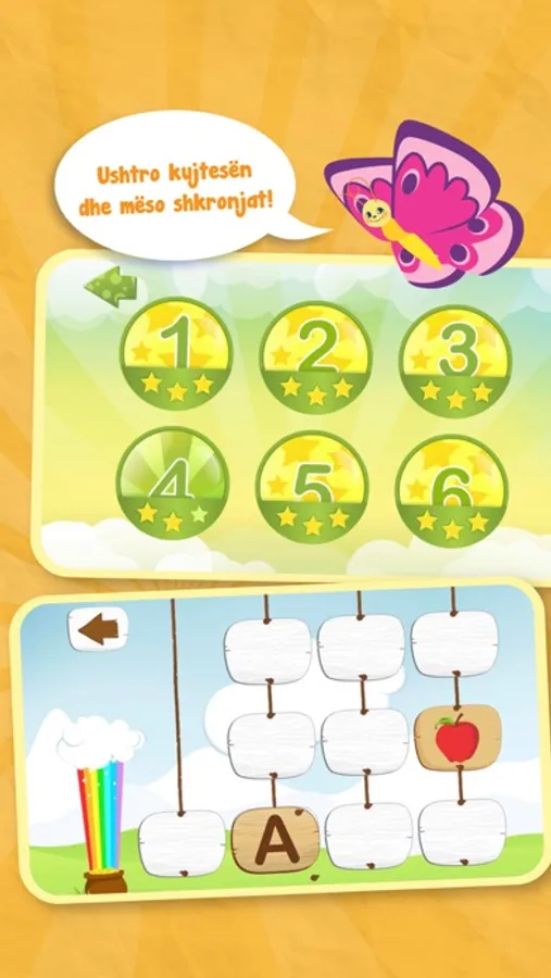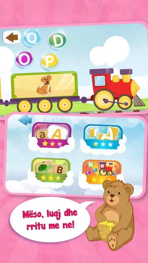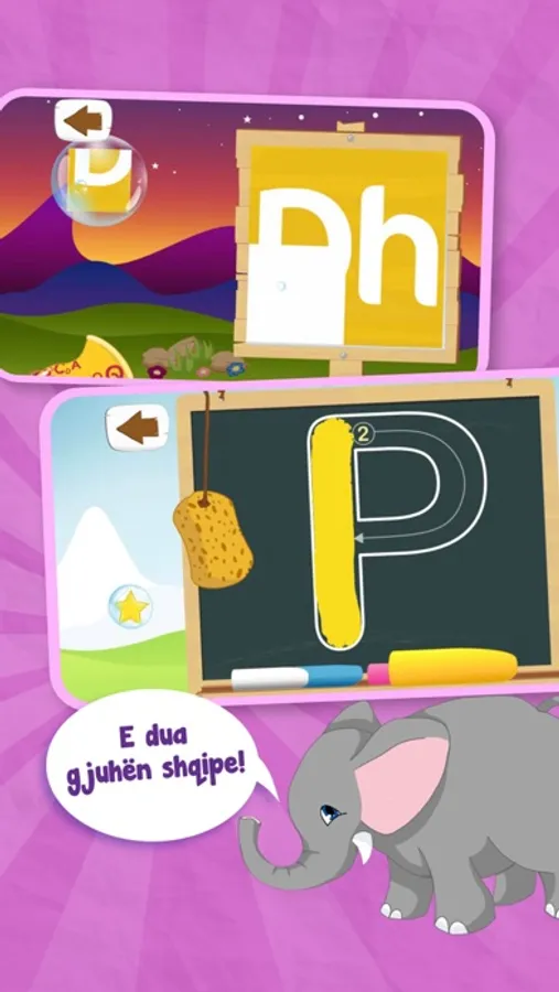 - Shkrimin e shkronjave në tabelë të zezë me katër ngjyra të ndryshme, ku nëse shkruan shkronjën si duhet atëherë merr 3 yjet maksimale, ndërsa nëse gabon mund të përdor shpuzën për fshirje.