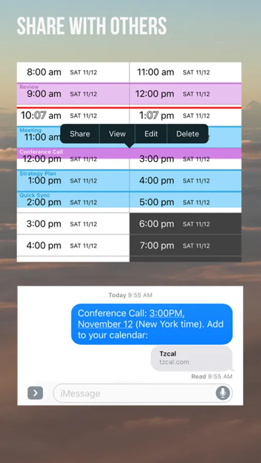 • Share events to other users of Timezone Calendar – you share from your timezone, they tap a link, and it will appear in theirs.