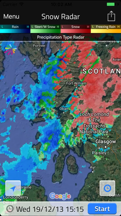 Use MetDesk’s high resolution snowfall radar to see exactly where precipitation is falling as snow, sleet, rain or freezing rain on a fully zoomable map. The animated visualisation allows you to see the snowfall radar in 5 minute time-steps over the last 2 hours, as well as a forecast for the coming 2 hours. Beyond 2 hours ahead, the app includes an hourly forecast for the next 48 hours ahead.