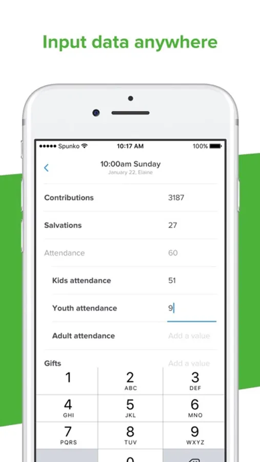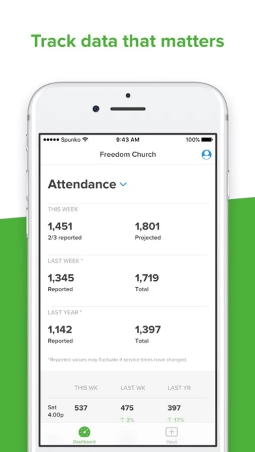 • Input data in real time—upload info like parking lot tallies, kids ministry numbers, salvations, and main auditorium attendance in real time during your services.