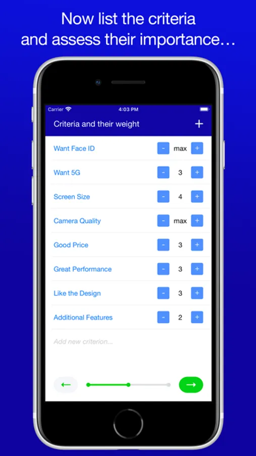 + allows to change the order of decisions, options and criteria (tap and hold)