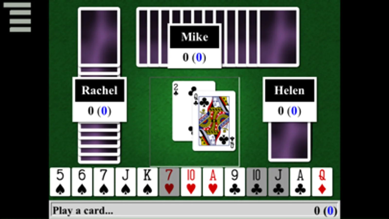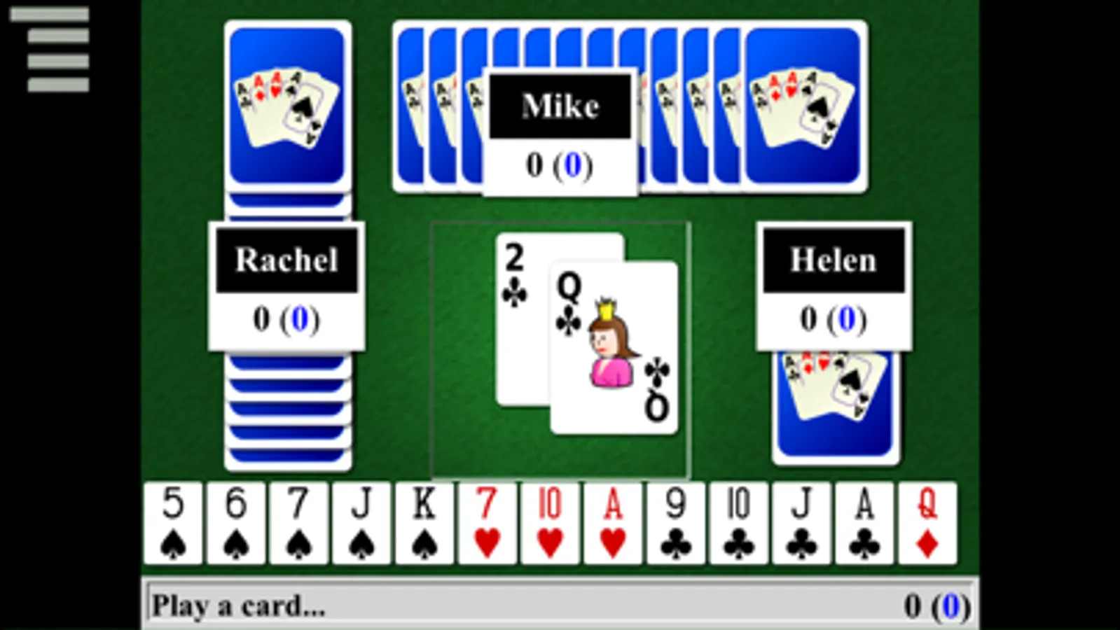It's a trick taking game involving 4 players, where the object of the game is have the lowest score when one person gets more than 100 points. The game starts by dealing 13 cards to each player. Each player passes cards, then plays in sequence, with the objective being to avoid all the hearts and especially the Queen of Spades!