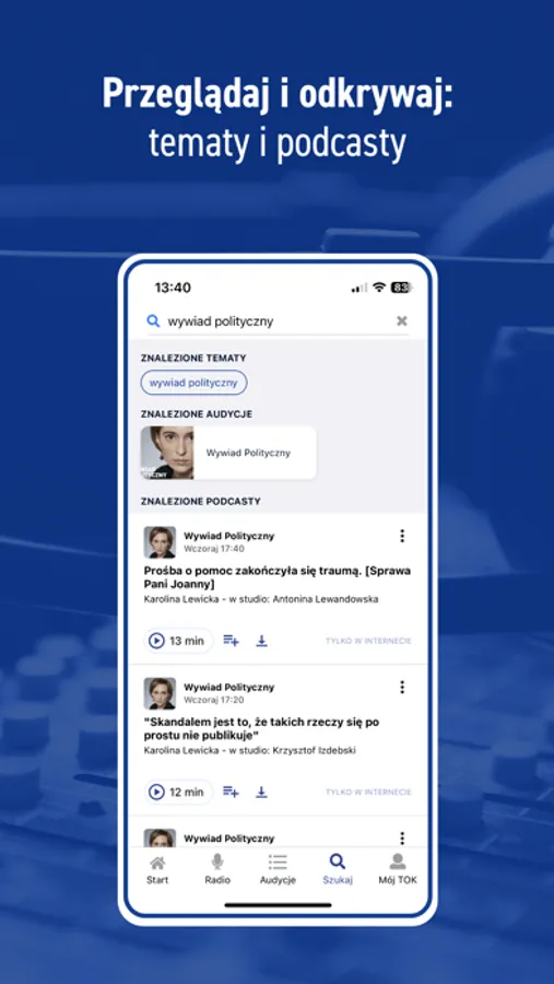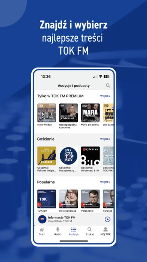 - Własne listy podcastów w zakładce Mój TOK: Obserwowane, Moja Playlista, Historia