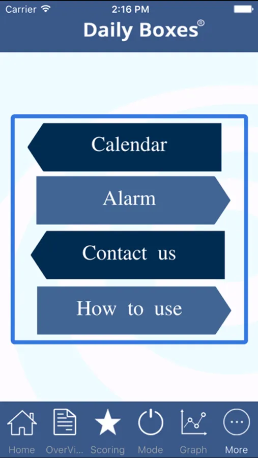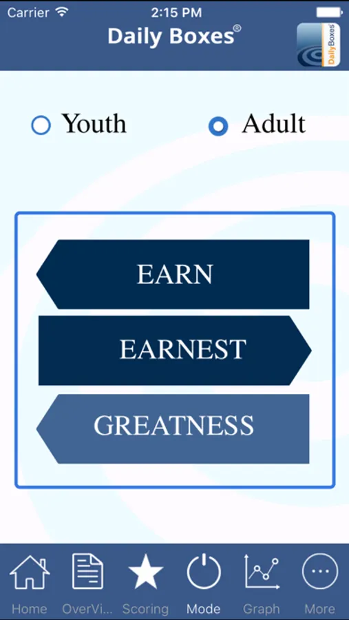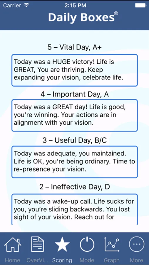 The Daily Boxes® app is designed so you can effectively manage and expand nine areas of life that are vital to your flourishing as a human being. You simply score yourself every day in each area on a scale from 1 to 5. (See the Scoring tab for more details) By using The Daily Boxes™ app you will create amazing new and unpredictable results in your life. You will expand your capacities in these vital areas and create new traits and behaviors that will impact your life profoundly. You will reap benefits you have not yet even considered.