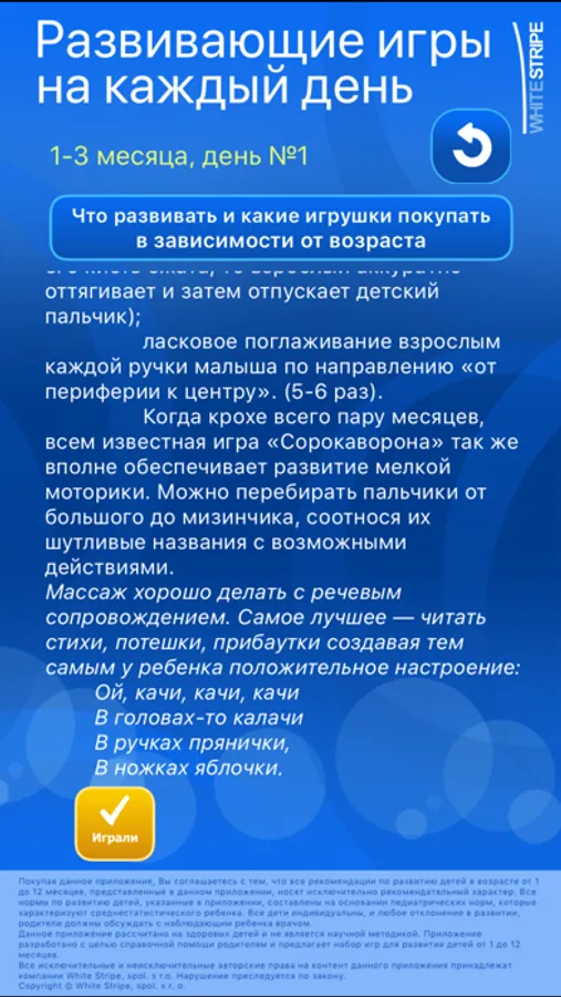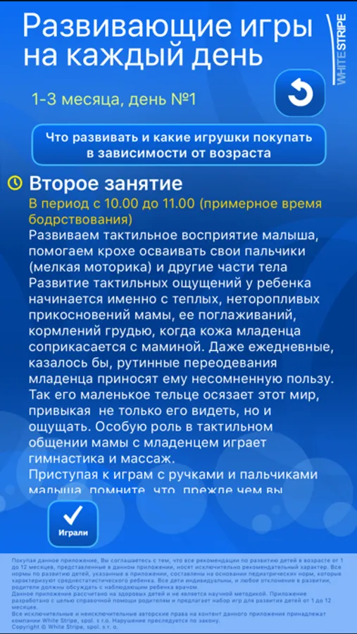 В приложении также есть разделы, в которых подробно расписаны этапы психического и физического развития детей от рождения до года, даны четки рекомендации о том, что развивать у ребенка в каждом возрасте и какие игрушки покупать ребенку на определенном этапе его развития.