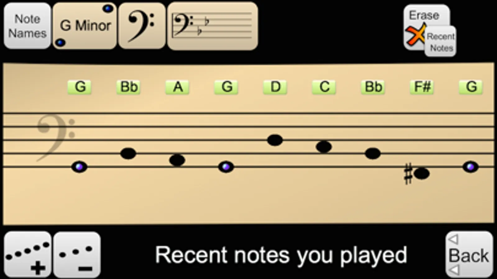 Set your clef and key signature (just match the pictures in your score) and then play the notes directly in the app, exactly how they look on the page. No theory, no remembering the note names (although you can display them if you want to), just touch and play.