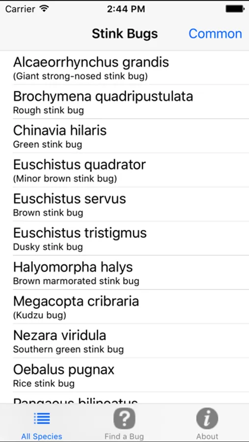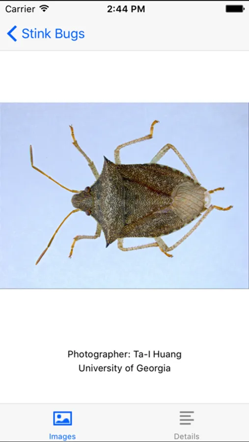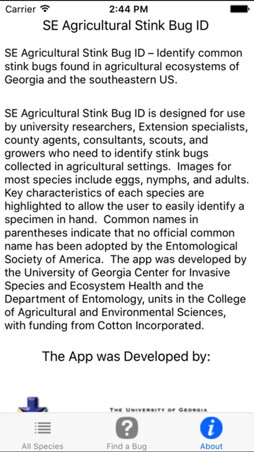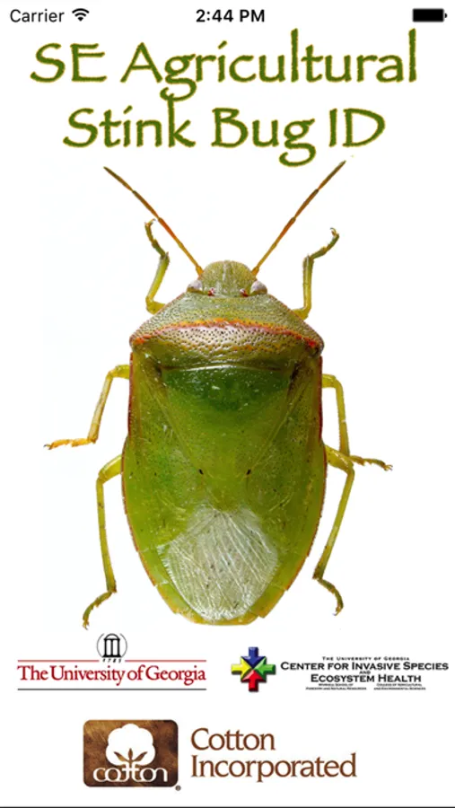 SE Agricultural Stink Bug ID is designed for use by university researchers, Extension specialists, county agents, consultants, scouts, and growers who need to identify stink bugs collected in agricultural settings. Images for most species include eggs, nymphs, and adults. Key characteristics of each species are highlighted to allow the user to easily identify a specimen in hand. Common names in parentheses indicate that no official common name has been adopted by the Entomological Society of America. The app was developed by the University of Georgia Center for Invasive Species and Ecosystem Health and the Department of Entomology, units in the College of Agricultural and Environmental Sciences, with funding from Cotton Incorporated.
