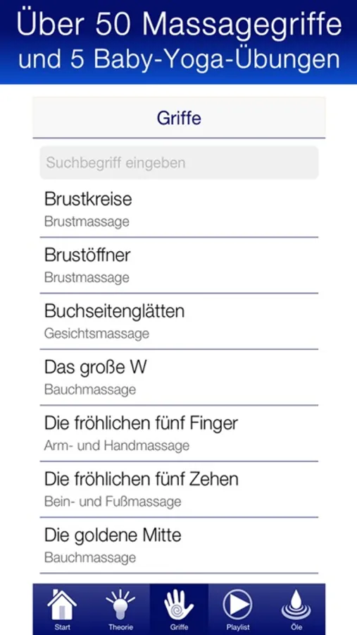 Mit dieser App bekommst du einen innovativen Massageplayer mit einfachen Anleitungen für über 50 verschiedene Griffe aus der indisch-schwedischen Babymassage nach Leboyer und Mc Clure sowie die 5 wichtigsten Übungen aus dem Baby-Yoga. Der Player verfügt über alle bekannten Funktionen eines Audioplayers und gibt dir darüber hinaus die Möglichkeit, eigene Massageprogramme in Form von Playlists zu definieren und abzuspielen.