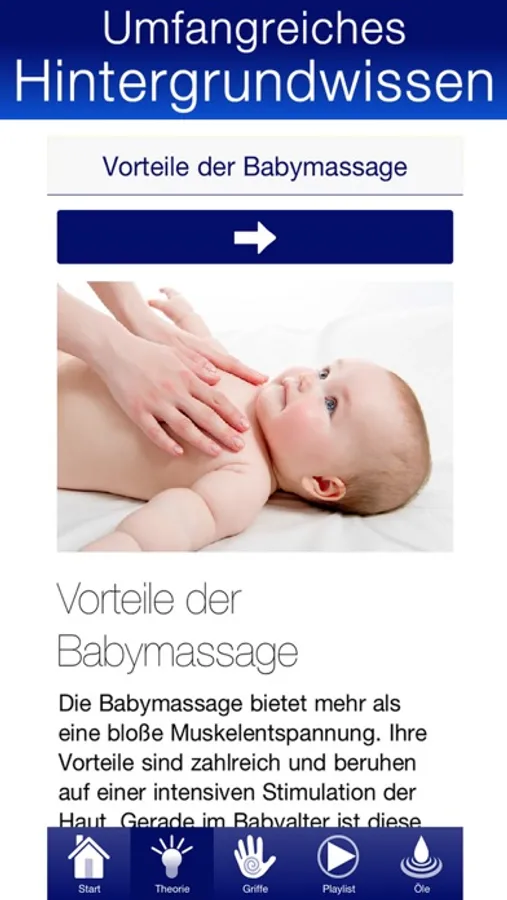 Mit einem übersichtlichen Theorieteil informiert die App zunächst über Vorteile der Babymassage, Rahmenbedingungen und das grundsätzliche Vorgehen bei einer Babymassage. Bilder und Texte veranschaulichen die Ausführung der einzelnen Griffe und machen die Massage so für jedermann – ob mit oder ohne Vorwissen – leicht erlernbar. Durch die Nutzung der Audiotracks wird ein Wechsel zwischen Massage und Lektüre vermieden. Du kannst dich so vollständig deinem Baby widmen. Gleichzeitig kannst du deine Massage von entspannender Hintergrundmusik begleiten lassen.