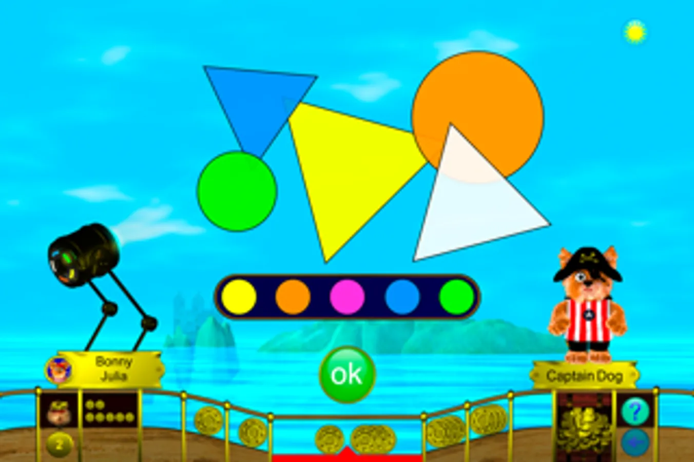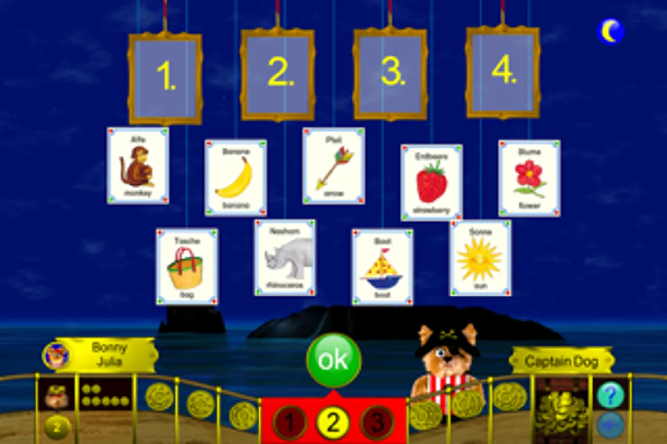 Captain Dog opens his treasure chests and sells the most beautiful pieces. The players need gold coins which can be won in different games (10 in the full version, 2 in the lite version). First, the players may choose a game, then it‘s Captain Dog’s turn. This guarantees that not only the favorite games are selected. Depending on the level of difficulty, players can win 1, 2 or 3 coins for any task which is solved correctly. The more difficult the task the higher the profit. But watch out! Whoever makes a mistake unfortunately has to watch Captain Dog grab the gold coins! The players get an immediate feedback on whether the task was solved correctly or incorrectly and the gold coins will be distributed accordingly.