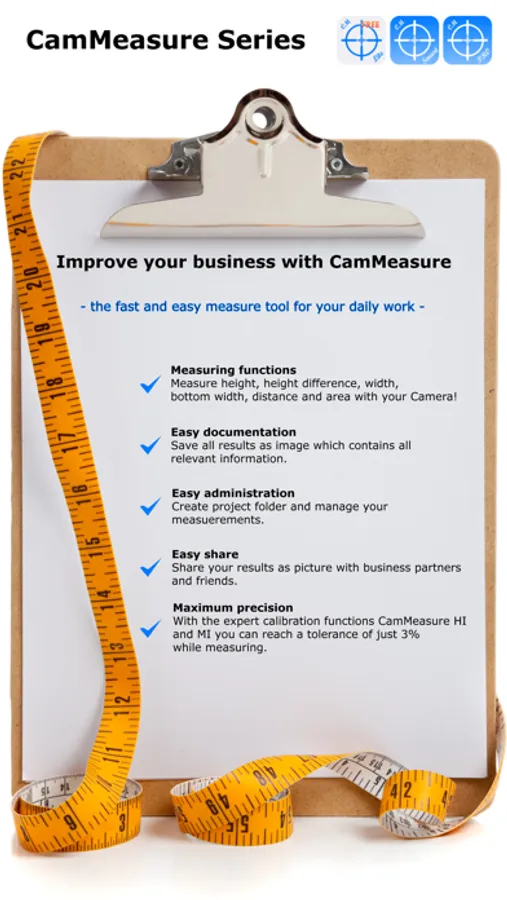 CamMeasure Pro is the iPhone-app with highest performance by measuring height, width, distances and areas. It is a must have for every tradesman, handyman, architects, constructor, booth builder, landscape gardener and any technical interested person. You are able to measure in between seconds by using one of the six measuring procedures. The results are going to be displayed directly within the camera view. You can save it as a picture. Within a few minutes you are able to measure complete rooms and manage your projects by using the integrated database for pictures. All functions and measuring procedures are explained by interactive videos. CamMeasure HI and MI has been developed to reach significant improvements of the measurements. Those calibration functions adapt the app to your individual measuring procedure. If CamMeasure is calibrated correctly and the measuring procedure is followed you are able to reach a tolerance of only 3% with CamMeasure Pro.