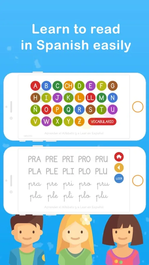 Educational App for Children "Learning to Read in Spanish" for kids in Kindergarten and Elementary School includes: