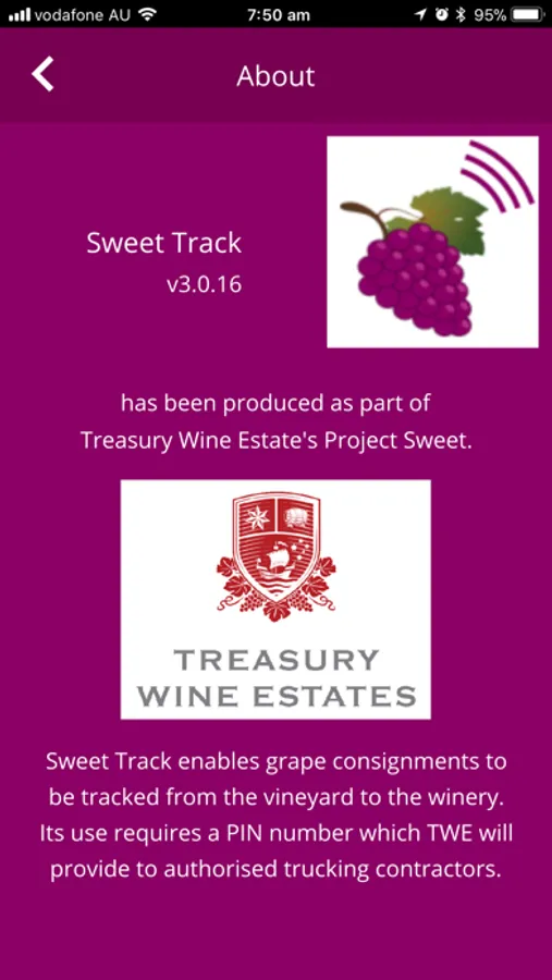 This App enables grape transportation bookings to be tracked from vineyard to winery, reporting location and time along the route to support Treasury Wine Estate's harvest logistics. The App requires a PIN number which can be obtained by transport contractors from TWE.