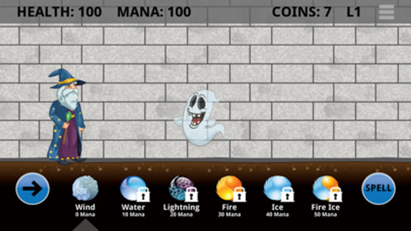 You are a Wizard who must save the queen from deep in the dungeon. You must fight your way through the monsters and save the Queen for a reward. You will get coins for killing monsters and from treasure chests at the end of each level. When you find potions and chests touch them to use them. Be warned that some chests also have negative effects. You will need to buy mana on the upgrade screen to use your powerful spells. As you progress through the levels, more powerful spells will be unlocked. You may need to go through a dungeon level several times to get enough coins to buy mana for the next level, so use your spells wisely. Touch the key at the end of each level to unlock the next level. Hurry and save the Queen because the kingdom is counting on you.