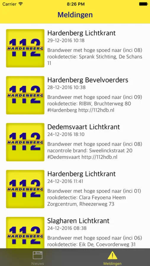 Download nu de app van 112 Hardenberg. 112 Hardenberg is de meest gelezen nieuwspagina van heel gemeente Hardenberg. Met deze app wordt het mogelijk om als eerste up-to-date te zijn van 112 meldingen, 112 nieuws en worden er pushberichten verstuurd wanneer er iets belangrijks in Hardenberg gebeurd. Dit houdt in dat als u een sirene hoort, u in de app kan vinden wat er aan de hand is en waar de melding plaats vind. Vanaf nu bent u dus helemaal op de hoogte van de 112 gebeurtenissen in Hardenberg.
