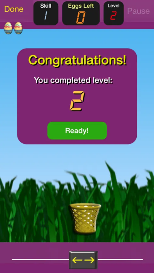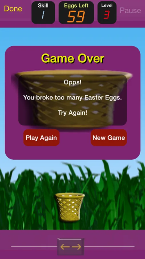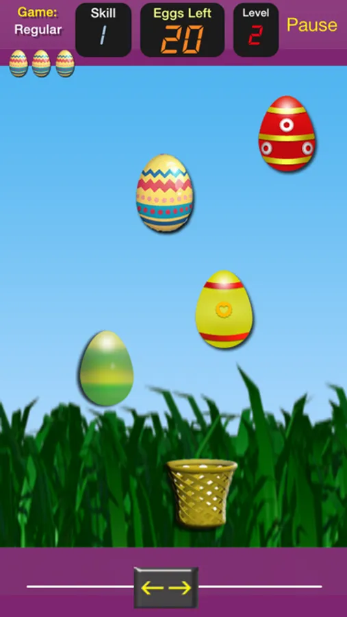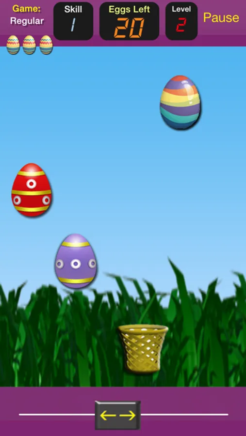 Catch the falling Easter Eggs with your basket before they hit the ground. Catch the required amount of eggs to complete each level. Each level gets more challenging. If you drop an egg it will break. If you break too many eggs the game is over!
