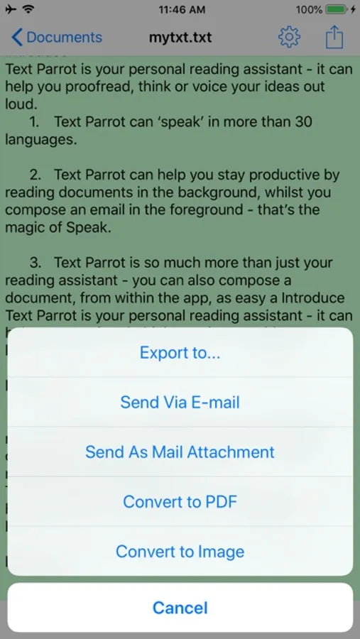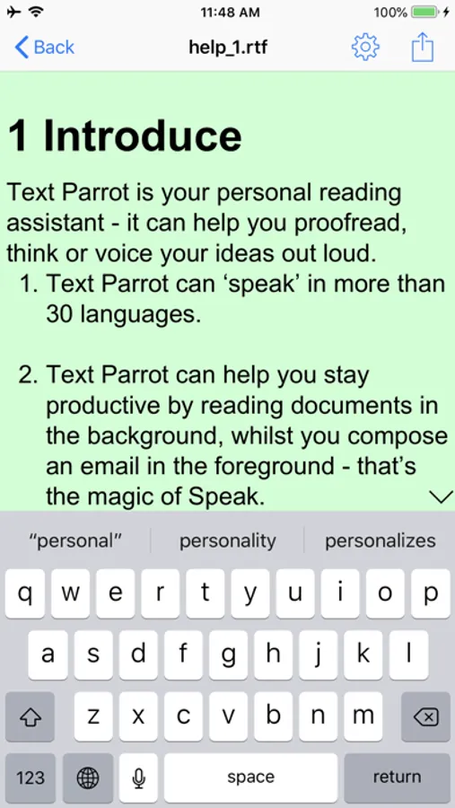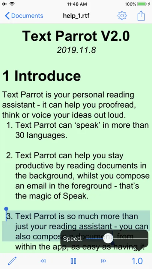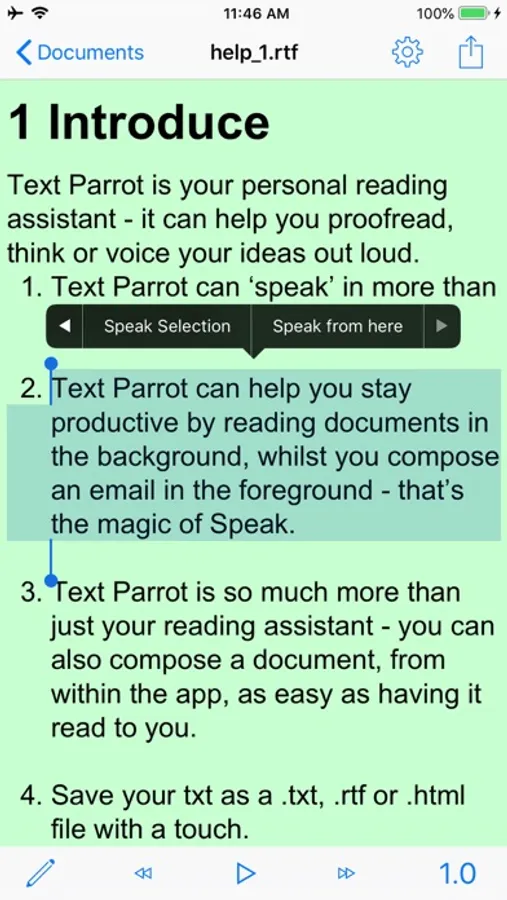 3 Text Parrot is so much more than just your reading assistant - you can also compose a document ( txt/rtf/rtfd ), from within the app, as easy as having it read to you.