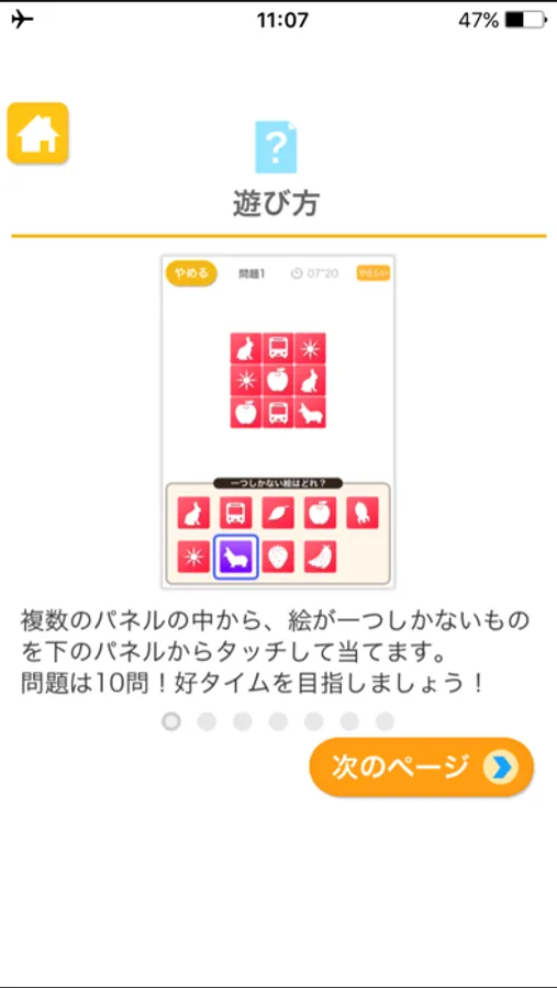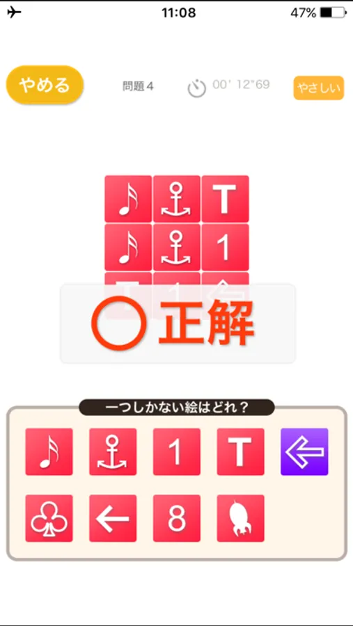 複数のパネルの中から、絵が1つしかないものを選ぶアプリです。