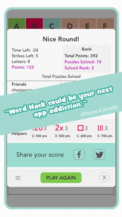 "Word Hack could be your next app addiction ... A nice, easy-to-understand user interface and a colorful design." - http://www.iphoneincanada.ca