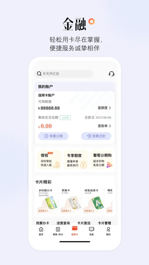 【聚焦金融服务,提升服务质效】常用功能如新卡办理、激活、账单查询、还款、扫码支付等一键直达,流程更顺畅、信息层次更分明,与用户的交互更人性化。