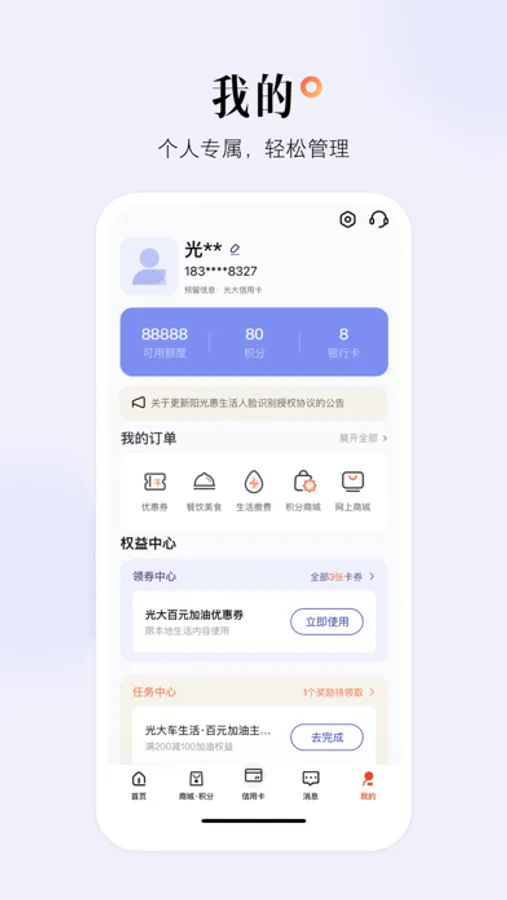 “阳光惠生活”,光大银行信用卡唯一官方App。是向客户提供信用卡信贷产品、用卡服务、饮食/娱乐/出行/购物等生活服务的一站式解决平台。