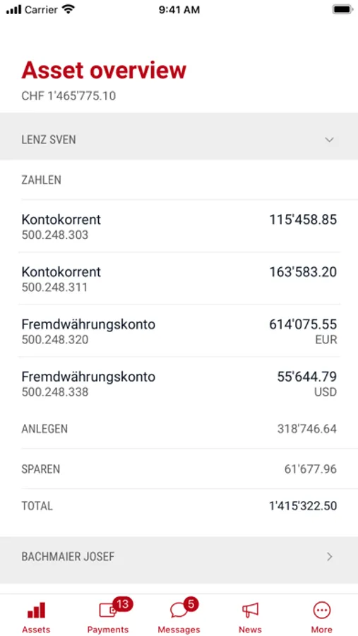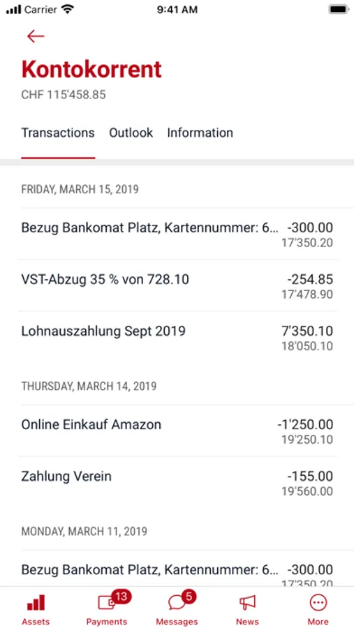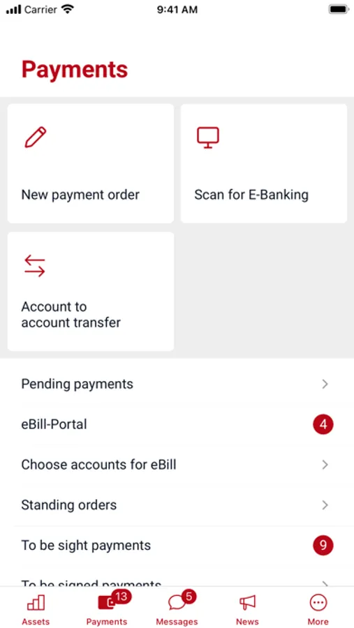 Manage incoming and outgoing payments; make account transfers; manage standing orders; scan paying-in slips; scan QR bills from your email inbox; approve payments