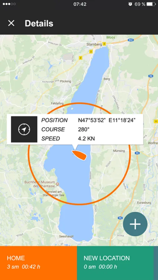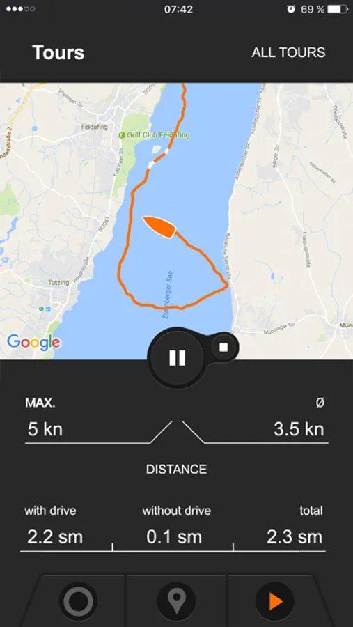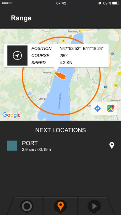 Use the map screen to view the GPS position, course and speed of your boat. A circle on the map indicates your remaining range – it’s easy to see how much farther you can go! Place waypoints and define your favourite locations, and estimate how long it will take to get there. Save your favorite locations in a list. All information is available in real time and takes into account prevailing wind and current conditions, as well as remaining battery capacity. TorqTrac makes use of Google Maps. (Note to Cruise owners with AGM or lead gel batteries: To use the range display, the battery capacity must be activated in the Set-up menu. - see Cruise operating manual for more information on our website at www.torqeedo.com > Service Centre > Manuals)