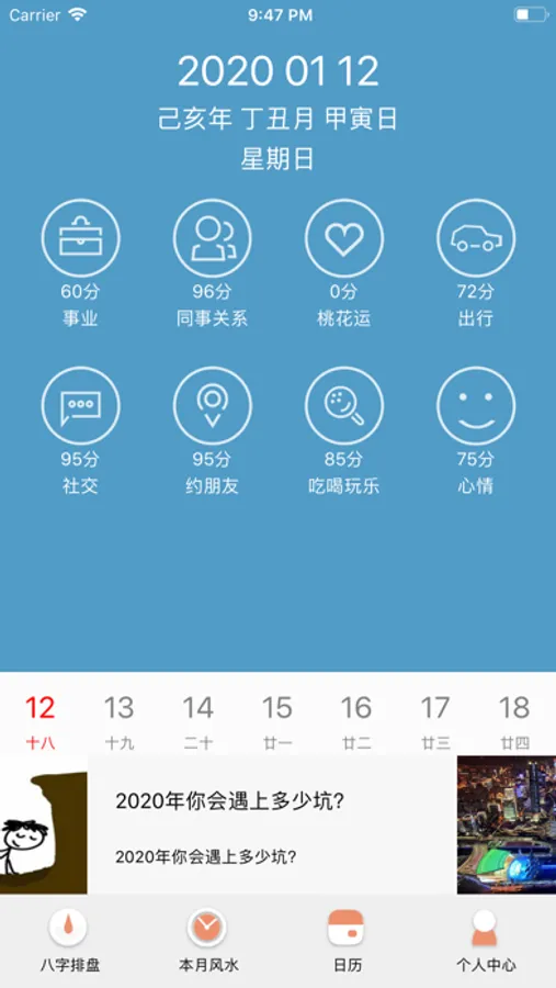 《好运日历》是全球第一款私人定制运程日历。软件运用传统命理学智慧与现代科技相结合,致力于打造内涵最丰富、最精准、最具吸引的个性化应用日历。日历内容涵盖财运、桃花运、事业运、棋牌运、炒股运、合作运等每天23项个人预测指导,它接地气的内容特点比起传统老黄历更具标新立异!