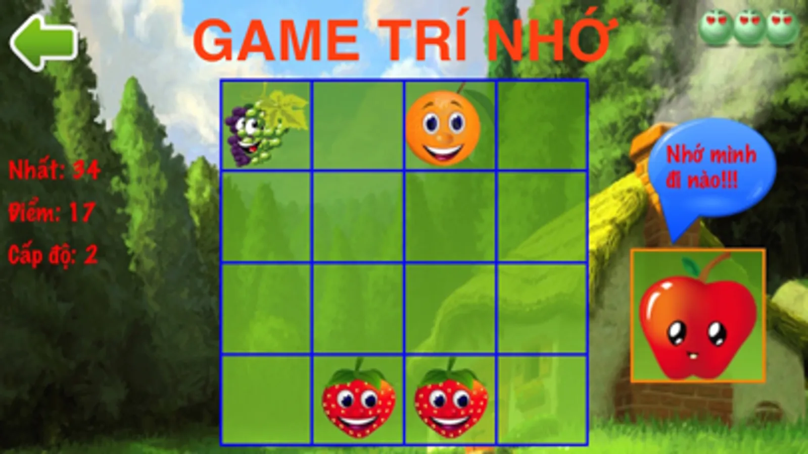**CÁCH CHƠI : Khi bắt đầu chơi,hình ảnh sẽ hiện lên trong vòng 1s,bạn hãy nhớ vị trí của hình ảnh . Sau đó khi hình ảnh mất đi bạn hãy bắt đầu chơi,bấm vào những chỗ hình ảnh đã xuất hiện mà mình nhớ được . Càng ngày độ khó càng cao,điểm càng cao,chỉ số thông minh càng cao !