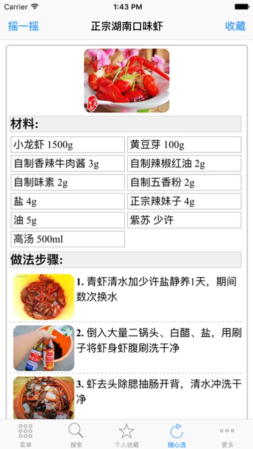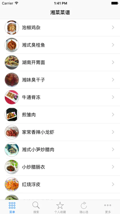 原生界面,完美适配。最简洁清新的湘菜大全,离线数据,全设备通用。一键收藏,摇一摇随机选择菜谱,支持全文搜索。