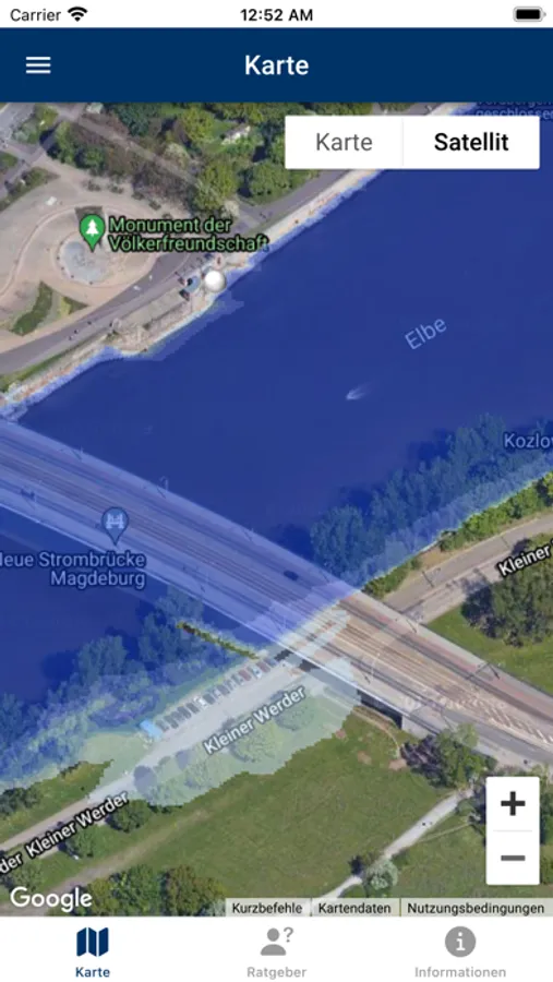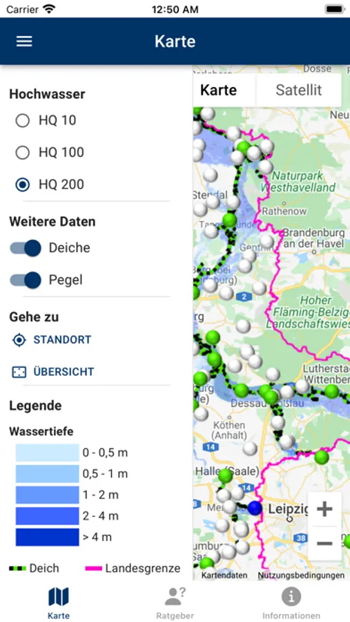 Mit der App "HochwassergefahrST" werden - im Bereich Karte - die Hochwassergefahrenkarten des Landes Sachsen-Anhalt visualisiert. Dargestellt werden die klassifizierten Wassertiefen von Flächen, die bei einem Hochwasserereignis überschwemmt werden. Die Darstellung kann für 3 definierte Szenarien mit unterschiedlichen Eintrittswahrscheinlichkeiten gewählt werden. Neben dem HQ100, das statistisch gesehen einmal in 100 Jahren auftritt, können die Auswirkungen der Hochwasserwahrscheinlichkeiten HQ10 und HQ200 veranschaulicht werden. Die Flächen zeigen dementsprechend keine abgelaufenen Ereignisse, sondern stellen Berechnungsergebnisse mit einer definierten statistischen Eintrittswahrscheinlichkeit dar.